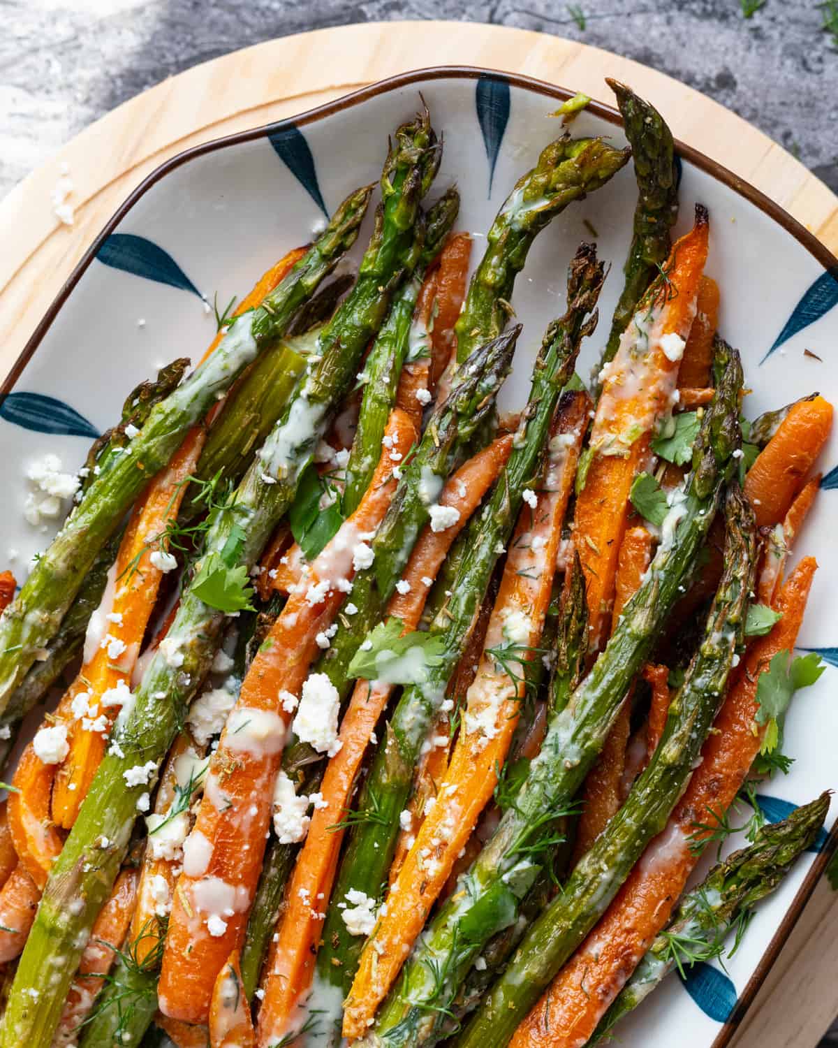 Crunchy and perfectly roasted asparagus and carrots served with a creamy dairy-free hummus dill sauce. This isn't just another side dish; it's a delicious way to serve up some veggies or add a pop of color to your holiday table.